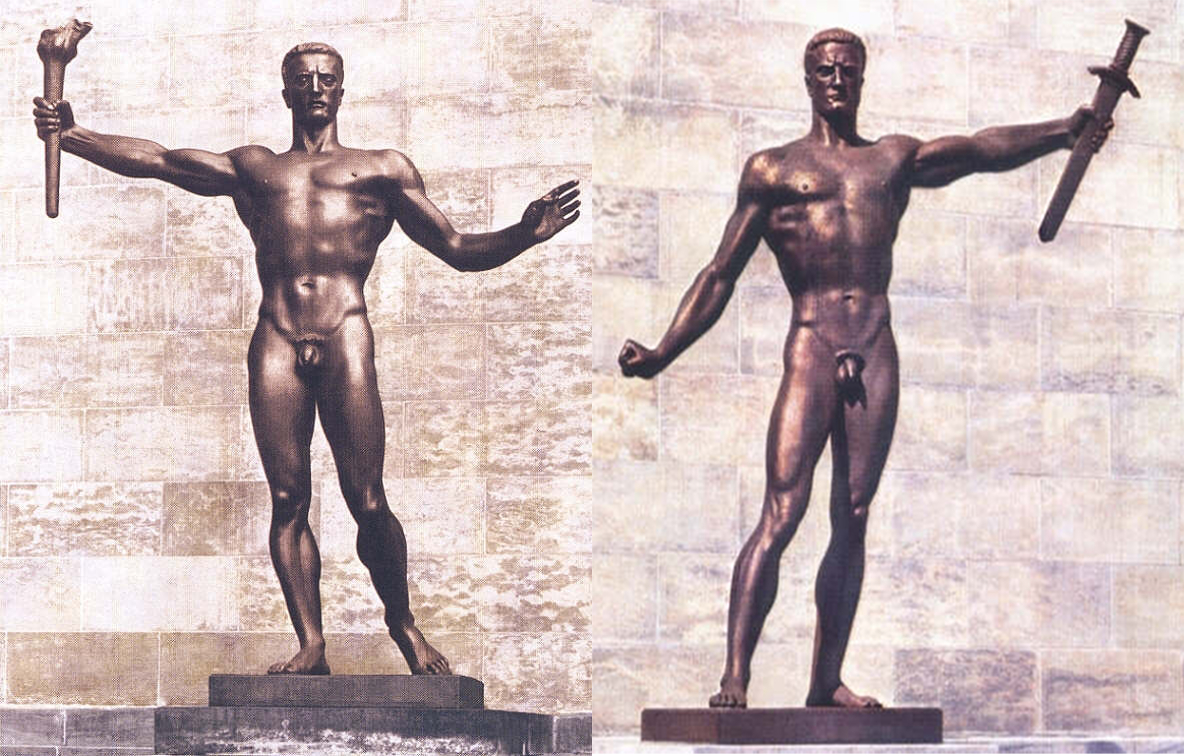 En la estatuaria sería Arno Breker (1900-1991) uno de los más famosos. En su época de formación conoció a Rodin en París y viajó a Roma en donde entró en contacto con la obra de Miguel Ángel, decidiendo volcarse en una estética realista y armoniosa. Comenzó a ser famoso por sus trabajos para el Estadio Olímpico de Berlín, pero tras su encuentro con el arquitecto Albert Speer –el arquitecto del Reich- su fama subió a lo más alto, principalmente después de la creación de un encargo que le hizo el propio Speer: las esculturas monumentales llamadas “El portador de la antorcha” y “El portador de la espada” para la entrada de la Nueva Cancillería de Berlín, edificio diseñado por el propio arquitecto de Hitler.
