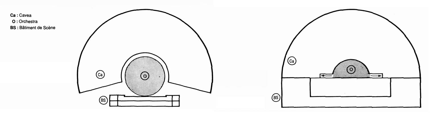 o a éstas de la zona llamada scaene, encontramos la orchestra semicircular también, en donde se colocarían los músicos. La principal diferencia entre los teatros griegos y los romanos, es que la orchestra en Grecia era siempre un círculo completo y después estaba el scaene; en cambio en Roma los teatros tenían su orchestra semicircular ya que por un lado estaban las gradas y por el otro el escenario rectangular. Palladio usa el modelo romano y tras el escenario coloca una fachada de varios pisos, totalmente decorada y con varias puertas (5 en este caso) por donde entraban y salían los actores.