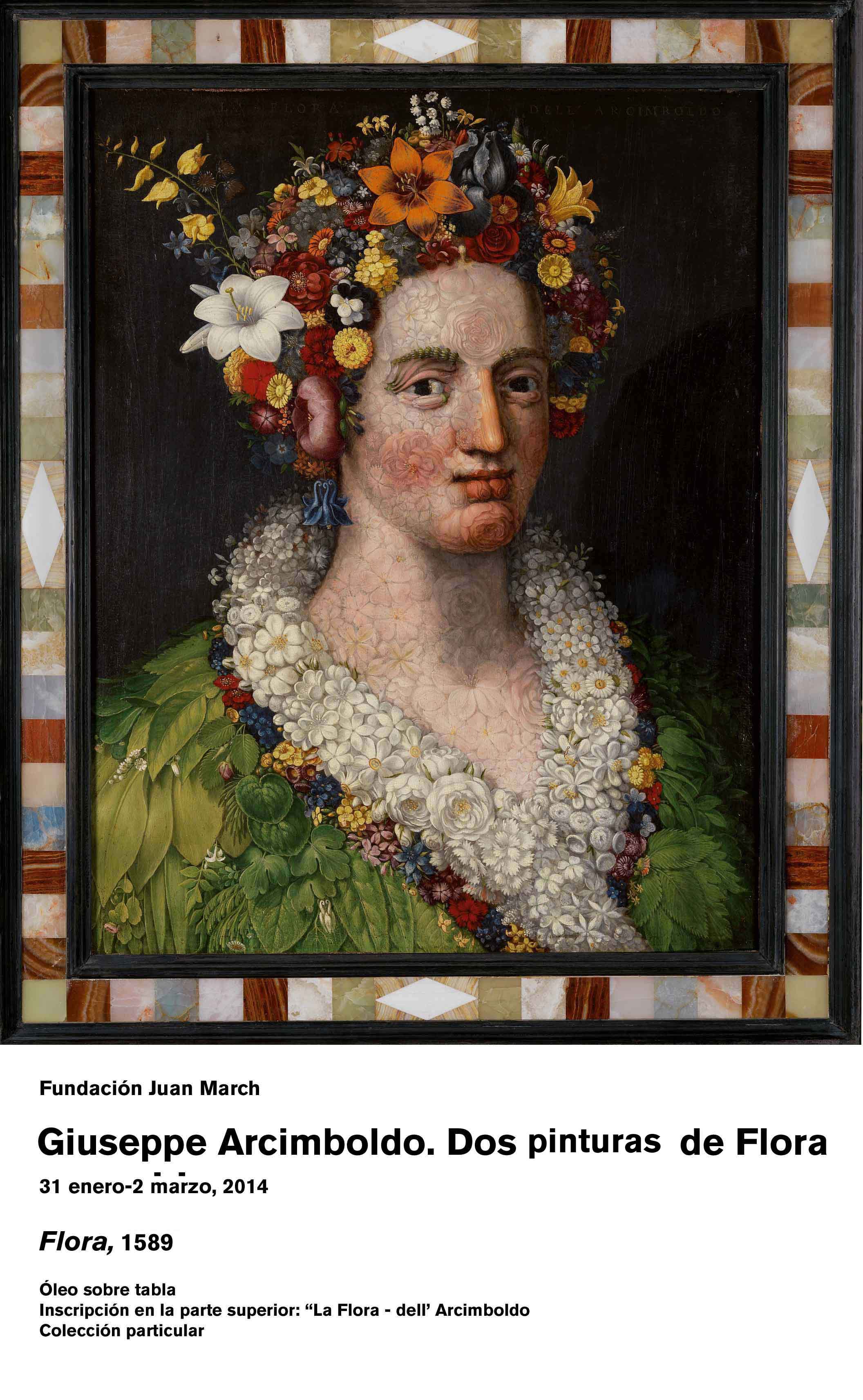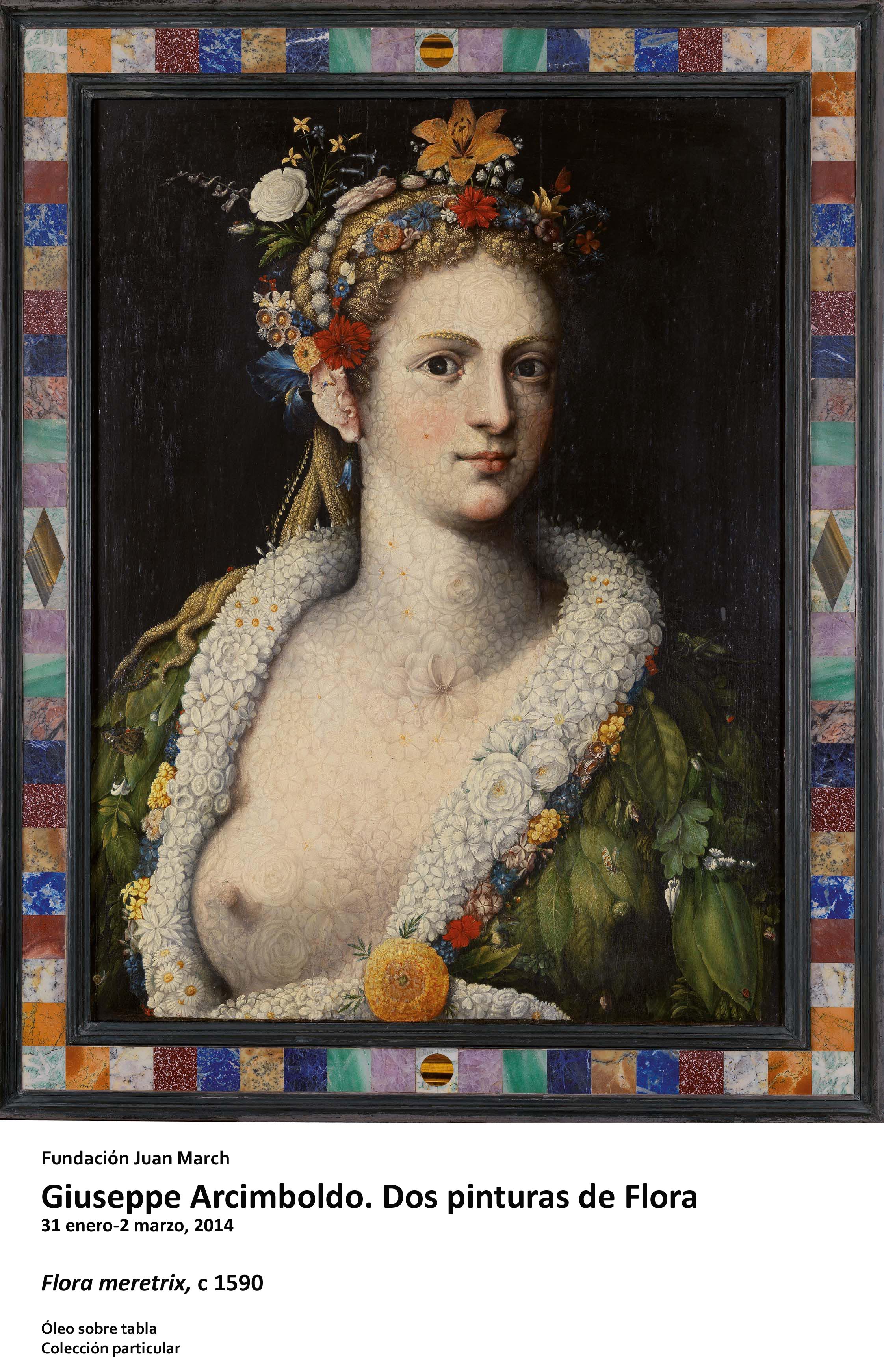 A la Fundación Juan March han llegado dos bellísimas Floras, con una postura frontal aunque ligeramente torcidas y cuyos rostros y cuerpos están completamente formados por flores y elementos vegetales. Generalmente la figura de Flora se relaciona con un modelo a seguir, ejemplo de belleza, elegancia y medida; siendo la deidad que traía la alegría y la vida al mundo después del largo y frío invierno. Varias han sido las mujeres que a lo largo de la historia se han retratado como ella, siendo una de las más famosas la que se relaciona, aunque con alguna duda, con Lucrecia Borgia como Flora de Bartolomeo Véneto (1502-1531), que se encuentra en el Museo Städel de Frankfurt. Ambos bustos de la March son la misma figura, la diosa Cloris que fue dejada embarazada por su amado viento Céfiro, tras esto se transforma en Flora y llena el mundo de colores. Según parece, Arcimboldo, tras trabajar para Rodolfo II de Austria y conseguir gran fama y dinero, vuelve a su Milán natal, pero sigue teniendo excelentes relaciones con su protector, el cual le dotaba de una suma anual. Para agradecerselo, Arcimboldo realiza, y le envía, estas dos Floras, teniendo en cuenta que Rodolfo era un gran amante de la botánica, además de enviarle también el ya citado Vertumno. Según parece la primera Flora sería del año 1589, y aunque nunca se ha hecho un estudio específico de todas las clases de flores que la componen, sí se hizo uno de la Primavera de la Real Academia de Bellas Artes de San fernando, dando como resultado que podían verse más de 80 flores auténticas de varios continentes. Junto a Flora, encontramos la otra, llamada Flora Meretrix, que se relaciona con la palabra meretriz y que se engloba en torno al año 1590, de cualquier modo posterior a la primera. En este caso Flora no aparece como sinónimo de pudor, castidar, virtud y fecundidad, si no como una Flora mundana y sensual que nos muestra un pecho, en cuyo pezón se puede apreciar una pequeña hormiga. Es curioso como en la Flora Meretrix se mezclan todo tipo de animalillos e insectos entre las hojas y flores de su cuerpo, quizás una alusión a esa Flora pervertida y no tan virtuosa como la primera, siendo los bichos símbolo a su vez de la fugacidad de la vida y lo marchito de la existencia, por lo tanto una Vanitas antropomorfa según mi opinión, teoría acentuada con los inquietantes tantáculos que son los cabellos que caen tras su cabeza. De cualquier modo probablemente esta segunda Flora se relacione con una legendaria prostituta romana que tras hacerse rica con sus servicios, decide, antes de morir, que se honre su memoria con la realización de varias fiestas y juegos llamados Floralias, y que tendrían un alto grado de connotación sexual.
