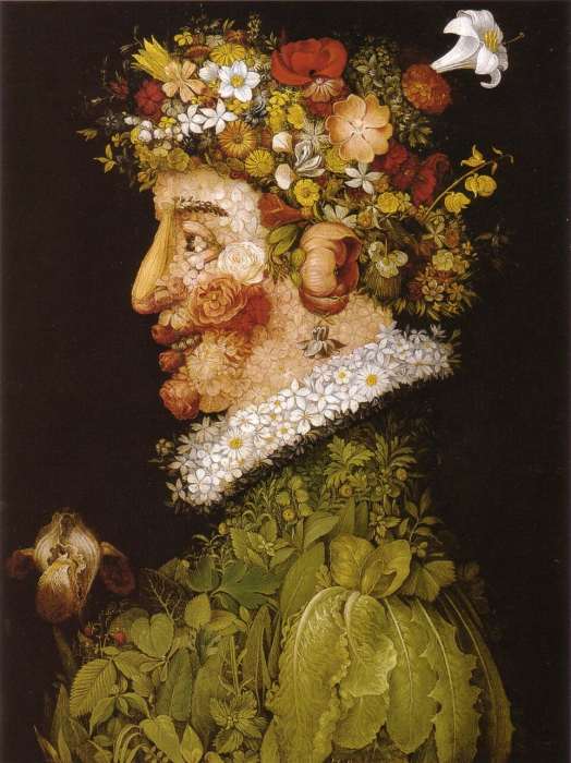 A todo esto debemos sumarle que hasta el 2 de marzo es posible ver una pequeña pero preciosa exposición sobre Arcimboldo titulada: Giuseppe Arcimboldo, dos cabezas de Flora, siendo la ocasión de ver juntas a estas dos obras maestras del arte que pertenecen a colecciones particulares. El milanés Arcimboldo (1527-1593) nació en una modesta familia de pintores, y fue famoso por la curiosa estética con la que hacía sus retratos, usando elementos de la naturaleza como flores, frutas, pescados, animales, e incluso a veces cañones, pistolas y hogueras, hacía retratos de personajes aristócráticos de su tiempo pero velados bajo la apariencia de seres mitológicos y alegóricos. Se dice que Arcimboldo no fue uno de los grandes genios del Renacimiento, pero con sus cabezas, o teste composte, encontró su estética y su camino, trabajando para cortes de un gran gusto artístico. Eran habituales las series de las Cuatro Estaciones o los Cuatro Elementos, así como de alegorías morales y terrenales como las Floras que se pueden ver en la Juan March. Arcimboldo trabajó largo tiempo en centro-europa, y cuando Praga fue tomada a la fuerza por las tropas Suecas en la Guerra de los 30 años, muchas de sus obras se diseminaron y llegaron hasta aquel país invasor. Uno de los ejemplos más famosos es el Vertumno (para muchos un retrato de Rodolfo II de Austria), deidad pagana símbolo del verano y de la abundancia de esta estación, que hoy se encuentra en el Castillo de Skokloster, cerca de Estocolmo, sin duda es una de sus tablas más famosas. Sin embrago es cierto que la obra de Arcimboldo está bastante repartida por el mundo, así se puede ver en museos de Viena (Museo de Historia del Arte), Denver (Museo de Arte), París (Louvre), Innsbruck (Castillo de Ambras), Florencia (Galleria degli Uffizi) o Madrid (Real Academia de Bellas Artes de San Fernando), en esta última hay una preciosa alegoría de la Primavera que fue parte de esas Cuatro Estaciones de las que hablaba antes. Arcimboldo fue largo tiempo olvidado hasta que se redescubre en los años ’30 del siglo XX, influyendo a mucho en artístas de vanguardias y del movimiento surrealista.