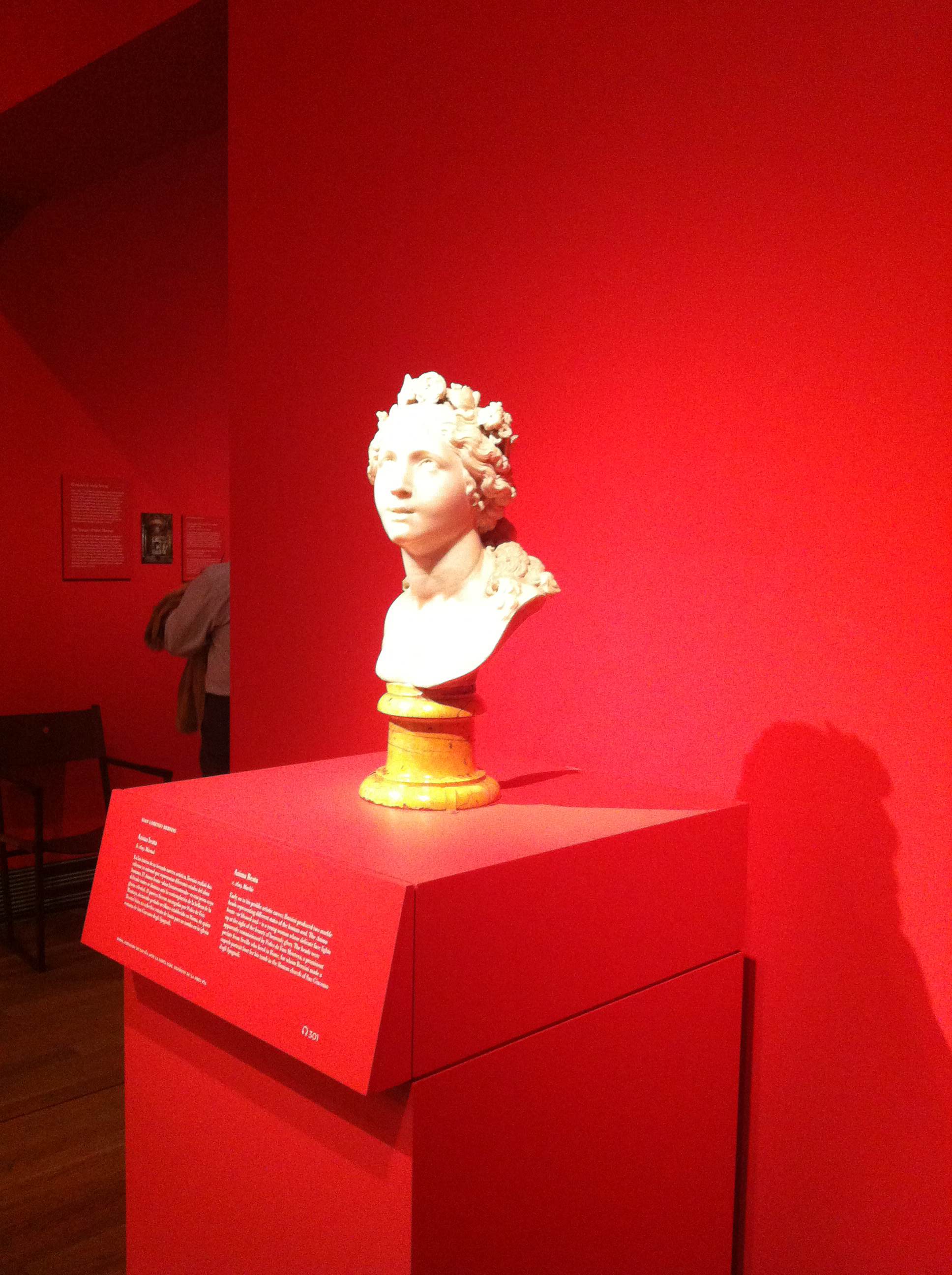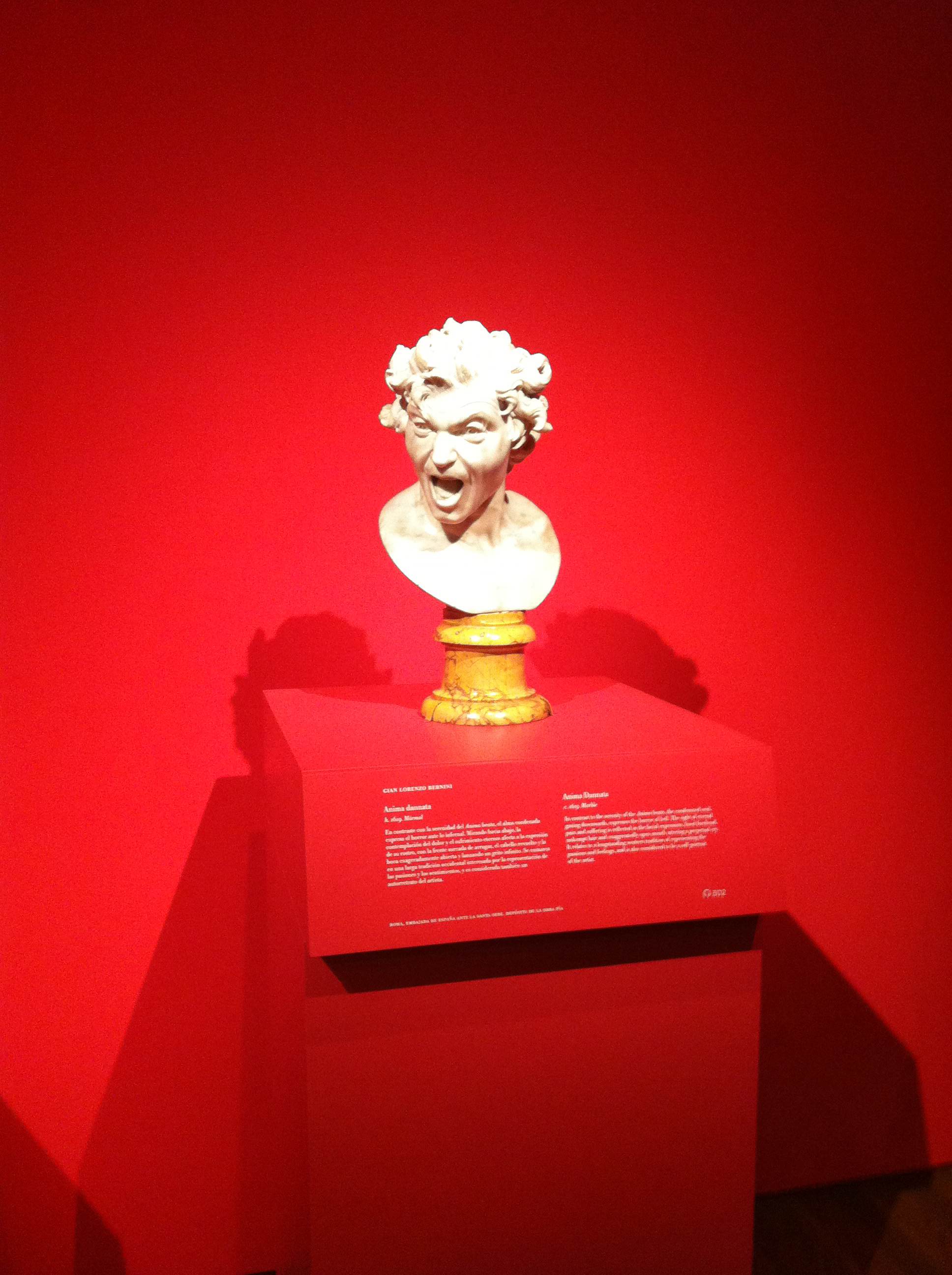 Esas cabezas se pueden ver ahora en el Prado. Son el Alma Beata y el Alma Condenada. La primera es una dulce joven, casi una niña, con una mirada que se pierde en el más allá, está viendo lo Divino, el Paraíso al que va a llegar. Tiene la boca entreabierta (ambas tienen la boca abierta, pero el gesto es muy distinto) y está coronada por una corona de lo que parecen ser rosas. En cambio la otra cabeza es un hombre, joven, pero no un niño; con la boca abierta en un grito desagradable, como su rostro, que es una mueca extraña, con el pelo enredado y las cejas muy subidas. Se cree que esta segunda cabeza, a mi gusto la mejor de las dos, podría ser un autorretrato del propio Bernini, se usó a sí mismo como modelo. Como he dicho antes, ese rojo de los muros, nos inquieta nada más entrar, nos hace sentir cosas, al igual que el arte barroco, arte de la Contrarreforma. Merece la pena tomarse su tiempo viendo y disfrutando de las dos cabezas con calma, ver el trabajo del trépano en el mármol, el pulido final y como las sombras modelan las expresiones. Estas piezas están siempre en Roma, aunque pertenezcan a España, y es una suerte que se puedan exponer ahora aquí.
