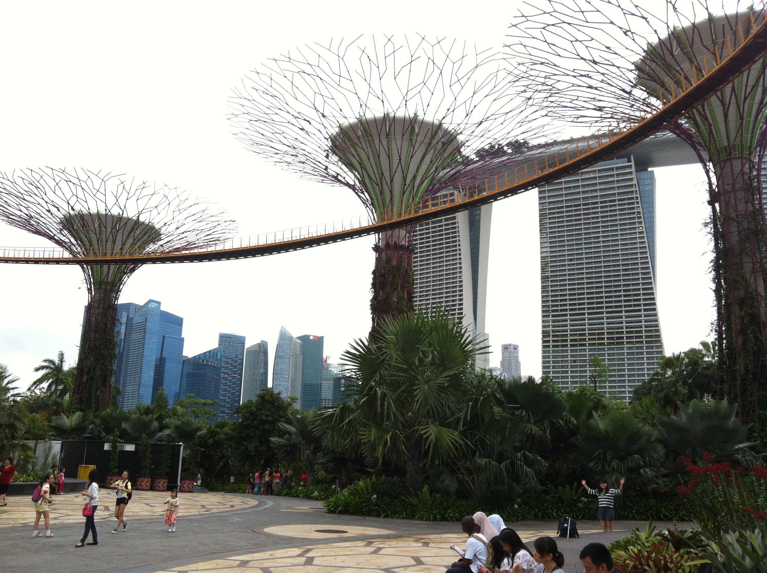 Pero el Marina Bay Sands no es sólo eso, junto al hotel se encuentra el Singapore Flyer, la noria panorámica más grande del mundo, el Museo de Arte y Ciencia de Singapur, con su curiosa forma de flor abierta, y el impresionante jardín botánico de Singapur, llamado Gardens by the Bay,  que se encuentra a la espalda del hotel-casino; en mi opinión estos jardines son de lo mejor que hay en Singapur. En este parque (de acceso gratuito, excepto al interior de los gigantescos y ultramodernos invernaderos) se encuentran los que poco a poco se van convirtiendo en el nuevo icono de la ciudad, los super-trees, o super árboles. Son unas estructuras metálicas de 50 metros, autosuficientes, autorreguladas energéticamente y por donde van trepando distintas plantas tropicales. En lo alto de una de ellas hay un bar y se puede caminar entre ellas, a casi 40m de altura, ya que hay una pasarela que las une, la llamada skyway. Yo recomiendo visitar la zona cuando esté cayendo la tarde, es el momento de mejor temperatura y además, según va anocheciendo, las estructuras de los super-trees se iluminan de llamativos colores.